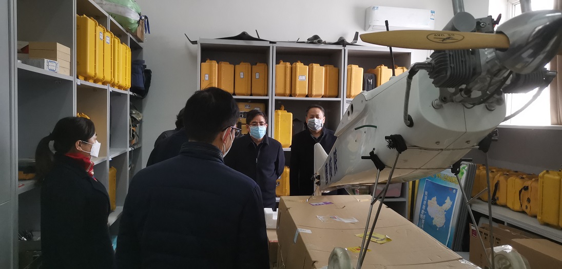 李靠社一行參觀了測繪院自主研發(fā)的“陜核鷹”油動力固定翼無人機和航測中心,對航空攝影測量的外業(yè)航飛、空三加密和內(nèi)業(yè)制圖做了詳細了解,與正進行內(nèi)業(yè)制圖的技術(shù)員進行了親切交流。