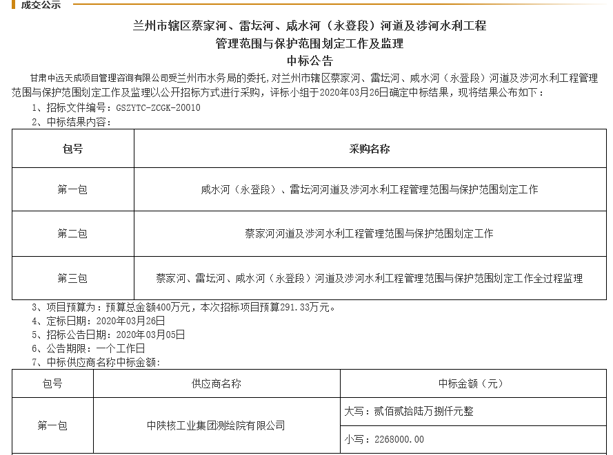 3月26日中陜核測繪院成功中標“蘭州市轄區(qū)蔡家河、雷壇河、咸水河(永登段)河道及涉河水利工程管理范圍與保護范圍劃定工作第一標段”(簡稱蘭州河湖劃界項目),合同額226.8萬元。截止今天,三個工作日公示期已滿。