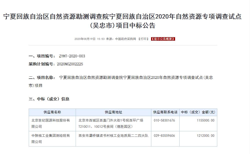 喜訊!中陜核測繪院中標寧夏回族自治區(qū)2020年自然資源專項調(diào)查試點項目
