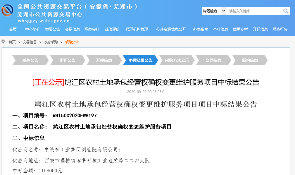 雙節(jié)獻(xiàn)禮,9月29日,從蕪湖市公共交易資源中心獲悉,測繪院以絕對的優(yōu)勢中標(biāo)鳩江區(qū)農(nóng)村土地承包經(jīng)營權(quán)確權(quán)變更維護(hù)服務(wù)項目,中標(biāo)總價115.8萬元。本次項目工作任務(wù)是對現(xiàn)有的土地承包合同、權(quán)屬證書及已下發(fā)的土地承包經(jīng)營權(quán)證書為依據(jù),對需變更地塊、暫緩確權(quán)地塊、漏確權(quán)地塊等進(jìn)行調(diào)查,并對已確權(quán)農(nóng)戶合理的變更需求及時進(jìn)行變更換證業(yè)務(wù)辦理。