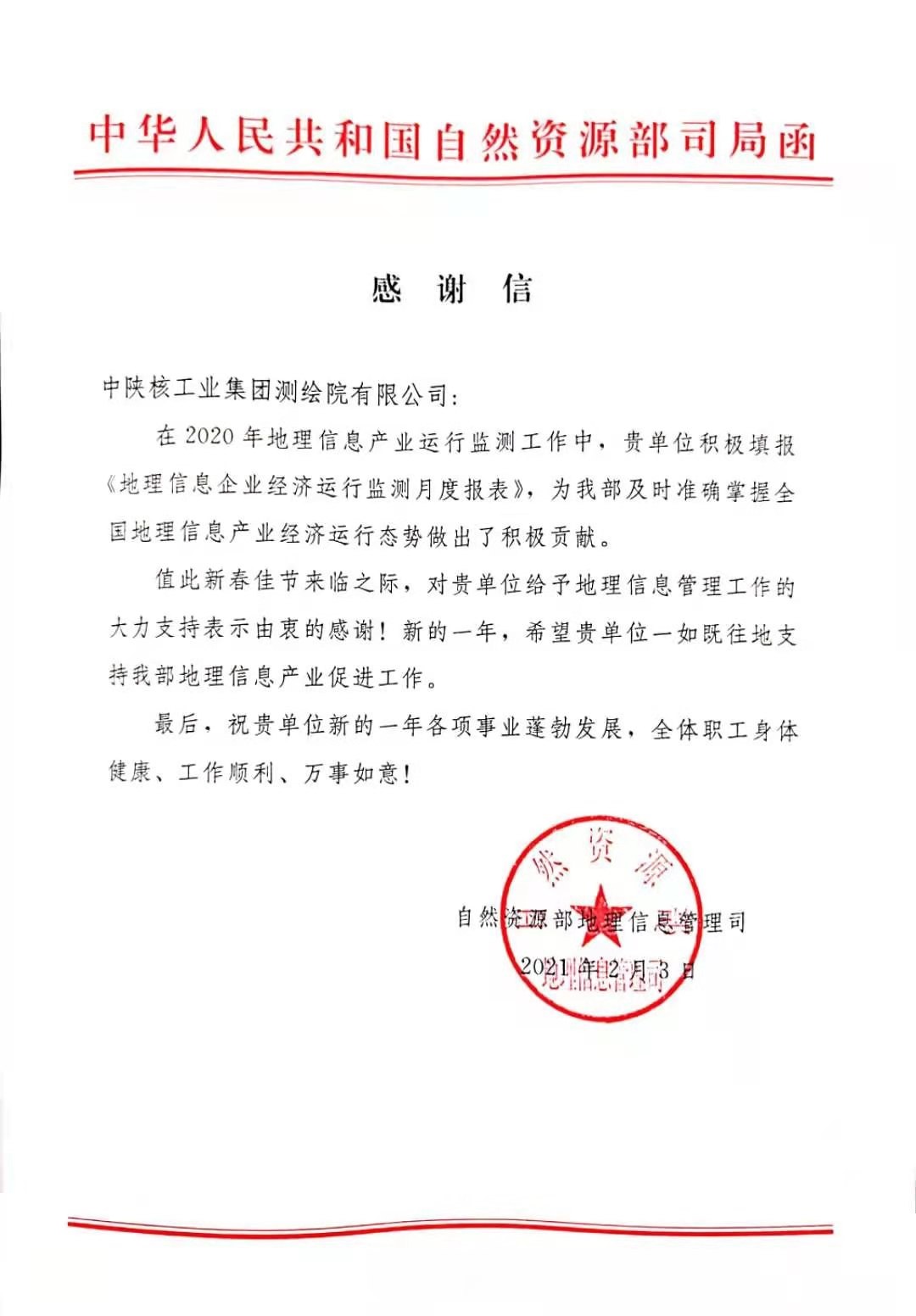 企業(yè)動(dòng)態(tài)2021年3月15日,中陜核測(cè)繪院收到了一份來(lái)自中國(guó)自然資源部的感謝信,用于感謝中陜核測(cè)繪院在全國(guó)地理信息產(chǎn)業(yè)經(jīng)濟(jì)運(yùn)行態(tài)勢(shì)中做出的積極貢獻(xiàn)。