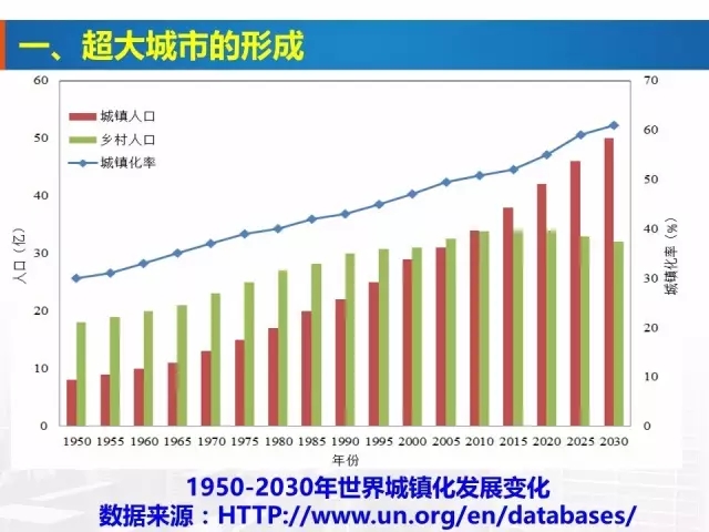 城鎮(zhèn)化是當今世界上社會和經濟方面最主要的一個活動。21世紀,全球人口的半數(shù)以上要生活在城市地區(qū),而且這個趨勢是不斷地在加快。每年超過6000萬人會涌入城市,平均每一周會有100萬人。而聯(lián)合國統(tǒng)計,全世界358個百萬以上人口城市中的153個在亞洲。在27個人口超過千萬級的“超級城市super city”,其中有15個會出現(xiàn)在亞洲。這就是我們城鎮(zhèn)化的速度。