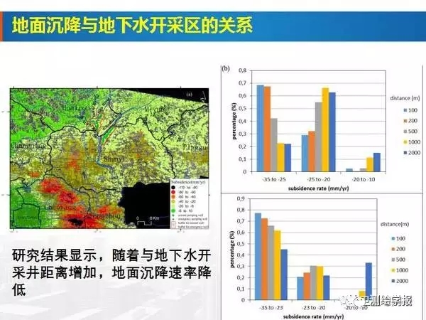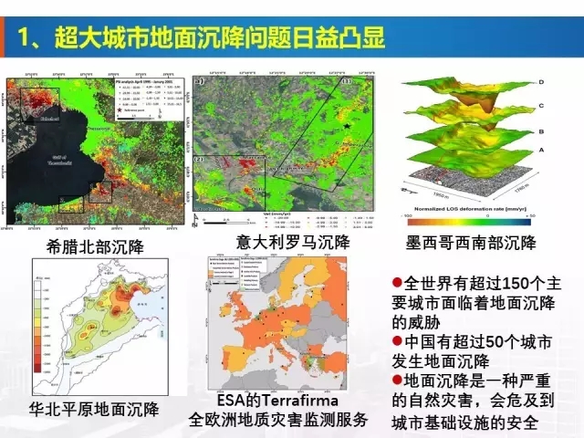 第一個,超大城市地面會沉降。這是國外若干個城市,從希臘、羅馬、墨西哥,還有我們華北平原的地面沉降情況,歐空局調查出來的數(shù)據(jù)。