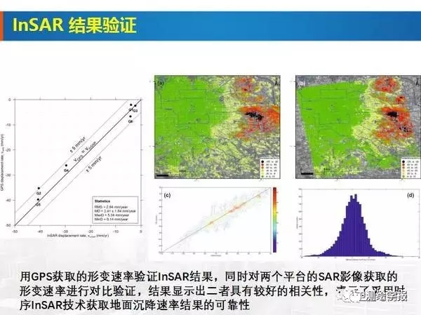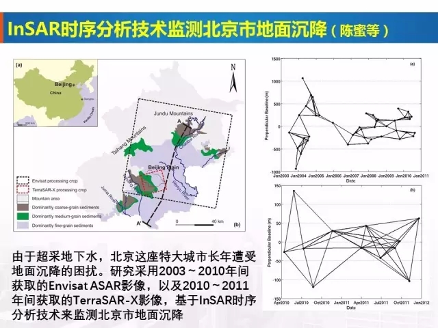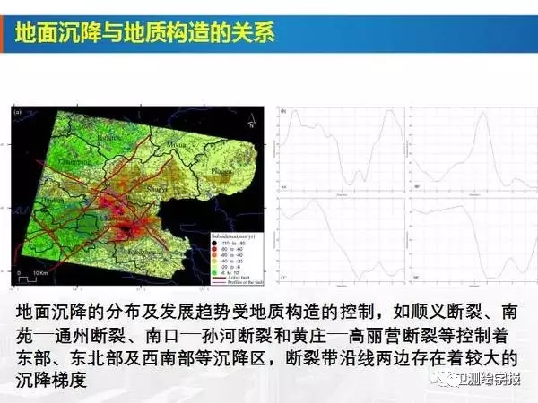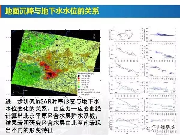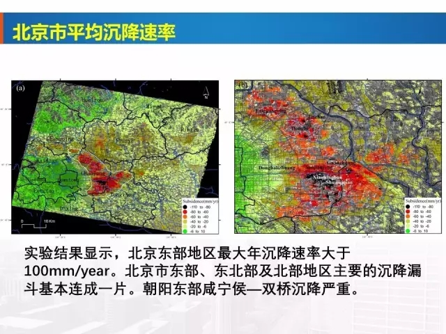 上圖是我們運用雷達遙感技術研究的北京地區(qū)地面下沉的情況。大家可以看這個紅的地區(qū),是一個漏斗狀的,它的年下沉速度達到了100mm/年,是在北京市東部、東北部交叉。朝陽東部咸寧侯到雙橋一帶,沉降嚴重,靠近通州,因為通州現(xiàn)在是一個副城市中心。我們用GPS、北斗驗證了剛才這個結論是正確的。