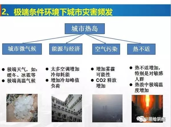 那么,第二個問題是城市的環(huán)境問題,我們稱之為城市熱島,包括城市微氣候、城市的能源和經濟、城市的空氣污染PM2.5、霧霾、碳排放還有熱不適。