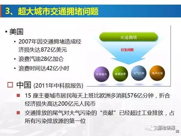 那么美國也有類似的問題,大家看2007年美國因為交通堵塞造成的經濟損失是872億美元,浪費的汽油,浪費的時間是42億小時。而中科院2011年的報告顯示,中國15座城市的居民每天上班比歐洲多消耗576億分鐘,折合損失也是200億人民幣。而釋放出來的尾氣,對我們的大氣污染有很大的“貢獻”,造成了霧霾、PM2.5等等。