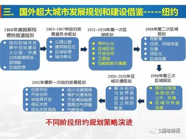 首先看看紐約,紐約做了多次的規(guī)劃,它的趨向是從城市規(guī)劃走向區(qū)域規(guī)劃,搞衛(wèi)星城,搞一個很大區(qū)域的可持續(xù)發(fā)展的城市,而不是簡單地“攤大餅”。這些衛(wèi)星圖顯示的是它發(fā)展的一個過程,整個大區(qū)域整體均衡的發(fā)展起來。