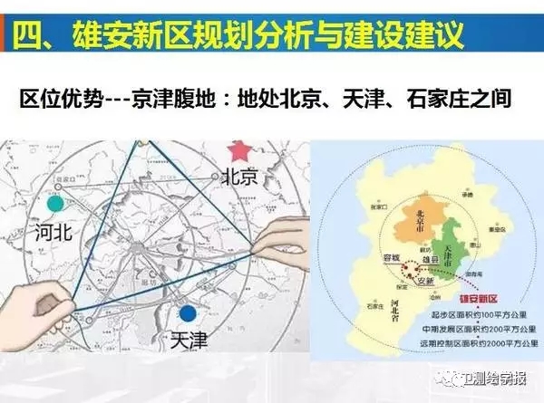 所以呢,講到這,我們覺得中央領導應及時地對雄安新區(qū)的發(fā)展重視規(guī)劃和建設的問題。我們認為,這個區(qū)域具有區(qū)位優(yōu)勢:它是一個京津腹地,跟北京、天津構成一個很好的德爾塔三角形 。