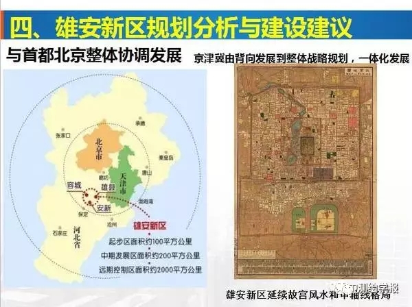 看看這張圖,北京、天津、雄安,雄安有可能按照我們的風水,故宮的風水,建成一個類似中軸線的格局。就使我們中國的文化、中國的文明得到一個很好的傳承。